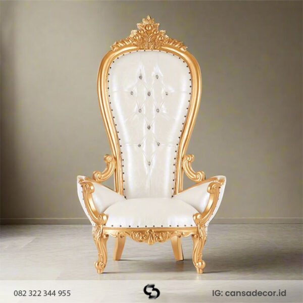 Kursi pengantin Syahrini dibuat dari bahan jati solid dengan desain megah bergaya royal wedding. Lapisan gold leaf yang mengilap dan ukiran tangan yang rumit menjadikannya bintang utama dalam dekorasi pelaminan.