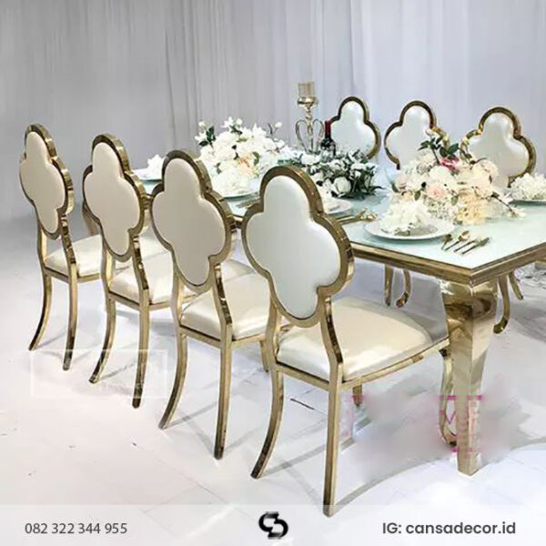 Desain kursi ini memadukan struktur logam yang ringan dengan gaya kontemporer. Besi hollow berlapis powder coating memberikan tampilan elegan serta ketahanan terhadap karat. Cocok untuk acara indoor maupun outdoor dengan konsep modern-minimalist atau industrial wedding.