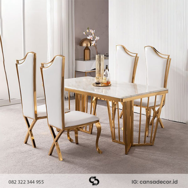 Desain kursi ini diciptakan untuk menghadirkan tampilan modern yang menawan. Detail lengkungan besi yang halus berpadu dengan warna gold elegan membuatnya mudah disesuaikan dengan tema apa pun. Struktur besinya kuat namun ringan, sehingga mudah dipindahkan tanpa risiko rusak.
