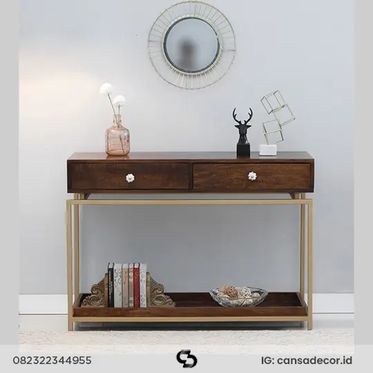 Selain sebagai meja pajangan, meja ini juga berfungsi untuk menyimpan barang kecil seperti kunci, dokumen, atau aksesoris dalam laci.