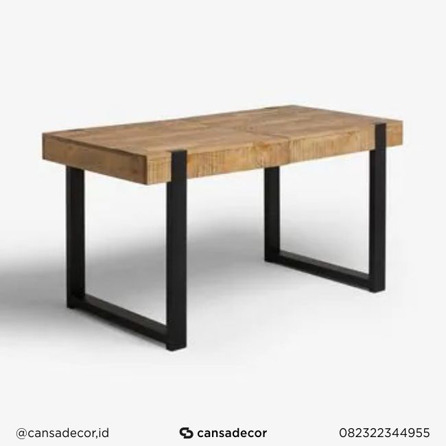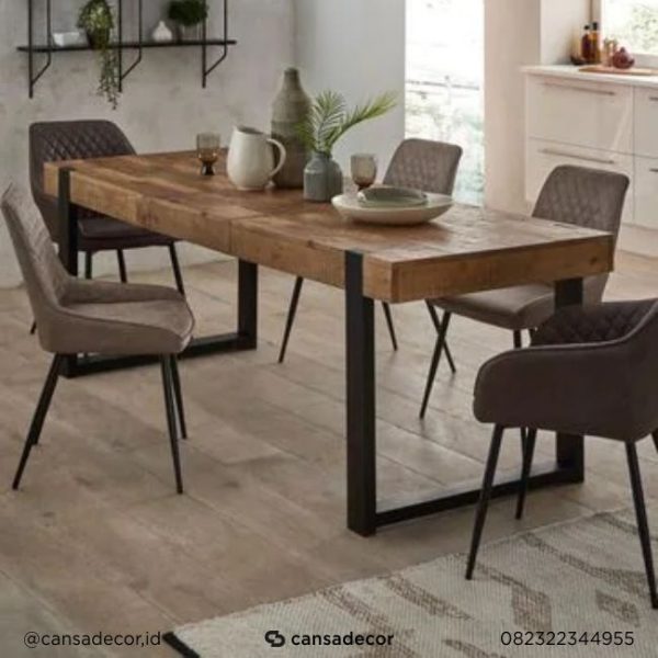 Model gaya meja makan ini adalah industrial dengan top meja menggunakan kayu jati belanda natural. Daya tarik meja ini dilihat dari keindahan serat kayu jati.