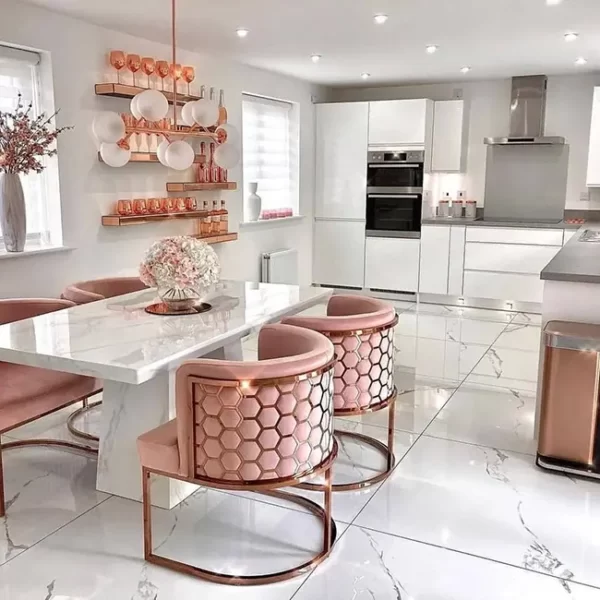 Selain estetik, meja marmer juga memiliki keunggulan dalam hal daya tahan. Permukaannya kokoh, tahan panas, dan mudah dibersihkan, sehingga sangat praktis untuk penggunaan sehari-hari. Dengan tambahan kursi bergaya kontemporer, ruang makan akan terlihat lebih rapi, mewah, dan nyaman untuk berkumpul bersama keluarga.