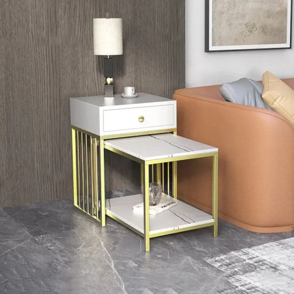Tampilkan kemewahan elegan di ruang tamu Anda dengan Meja Sudut Ruang Tamu Mewah – Putih & Emas.