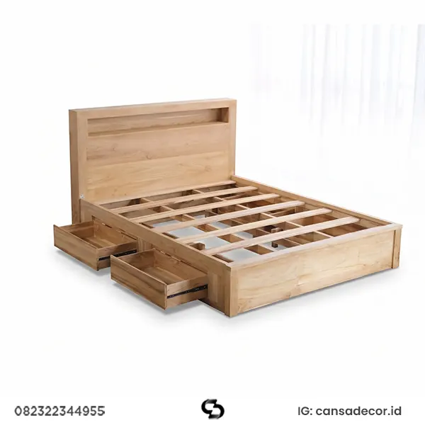 Dipan ini dirancang sebagai model ranjang minimalis yang mengedepankan efisiensi ruang. Rangka utamanya menggunakan kayu jati pilihan yang sangat kuat menopang beban, sementara sistem laci di bawahnya menggunakan rel berkualitas tinggi agar tarikan tetap halus dan awet. Sebagai model tempat tidur kayu minimalis modern, produk ini memberikan tampilan yang bersih sekaligus menyediakan gudang penyimpanan tersembunyi yang luas. Ini adalah model tempat tidur jepara minimalis terbaru yang wajib dimiliki oleh pemilik apartemen atau rumah dengan kamar terbatas.