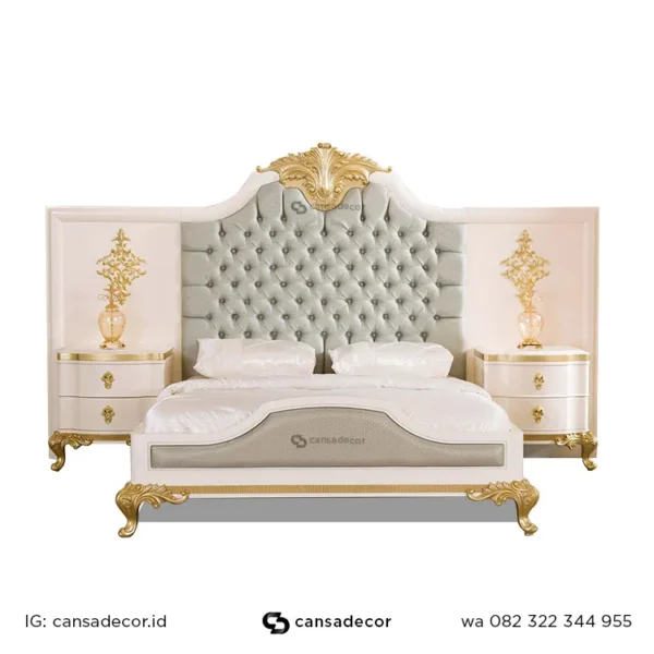 Selanjutnya, desain ini sangat fleksibel karena dapat dipadukan dengan gaya interior Modern Classic maupun Contemporary Luxury. Tidak hanya itu, bagian headboard yang tinggi memberikan kesan gagah dan menjadikan tempat tidur mewah jati ini sebagai focal point utama dalam kamar.